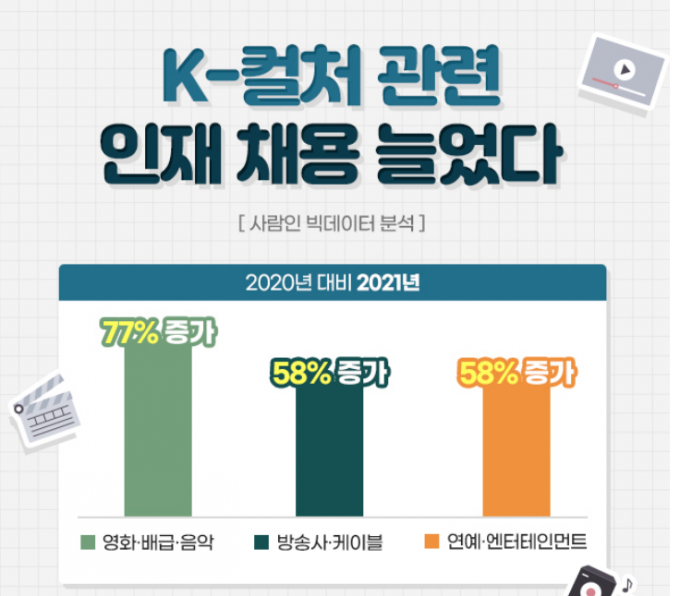사람인에 따르면 2020년 영화 '기생충'이 아카데미상을 수상한 것을 계기로 문화분야 인력 채용은 상승세를 탔고 2021년에는 '영화·배급·음악' 분야 기업의 채용공고가 전년 대비 77%나 늘었다.