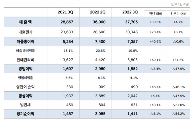 영업익은 품질비용 1조3602억원 반영 때문에 감소 현대자동차가 올 3분기 매출액 37조7054억원, 영업이익 1조5518억원을 기록했다.