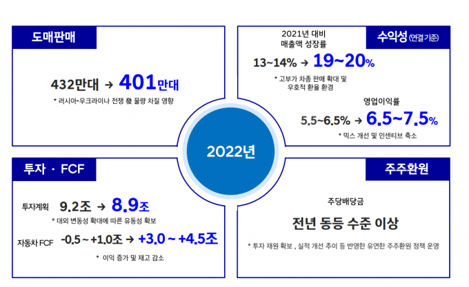 대내·외 경영환경 변화를 반영해 2022년 연간 도매판매 목표를 기존 432만대에서 401만대로 하향 조정했다.