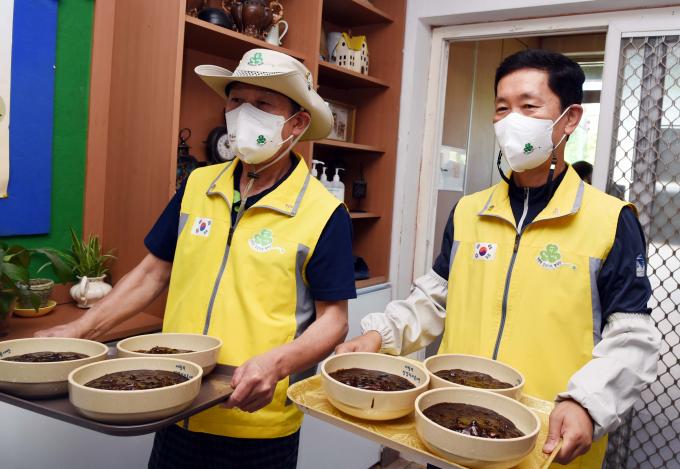 ▲ 짜장면 봉사 중인 이수영 씨(61, 왼쪽)와 이정표 경감(57, 오른쪽). [LG제공]