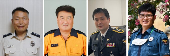 ▲ 수십년간 봉사를 병행해 온 LG 의인상 수상자들. (좌측부터) 음정삼 소방경(55), 김진규 소방위(56), 최석용 경감(57), 최재근 경위(50). [LG제공]