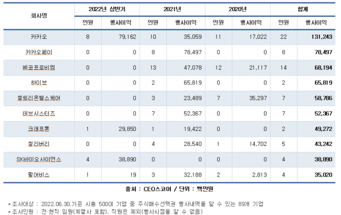 개인별로는 김종흔 데브시스터즈 대표가 475억원, 류영준 카카오페이 전 대표 409억원, 윤석준 하이브아메리카 대표 384억원, 여민수·조수용 카카오 전 대표가 각각 362억원, 338억원의 행사이익을 봤다.