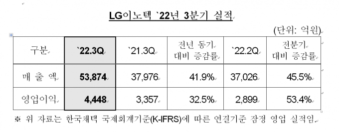 ▲ LG이노텍 '22년 3분기 실적 [LG이노텍 제공]