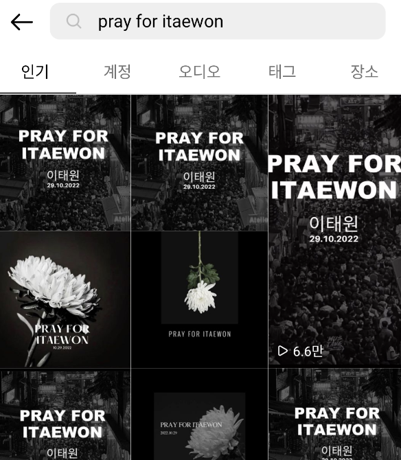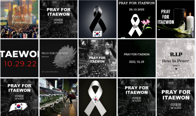 SNS에서는 'Pray For Itaewon'(이태원을 위해 기도한다) 문구를 해시태그(#)로 붙인 글과 사진들이 끝도 없이 이어지는 상태. 인스타그램과 페이스북에서 해당 문구로 검색하면 이미 수를 세기 어려운 추모 사진과 글이 표출된다.