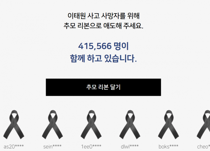 추모 페이지에는 '이태원 사고 사망자를 애도합니다'라는 글 아래로 네티즌들의 '추모 리본 달기'가 침묵의 시위처럼 흐르고 있다.