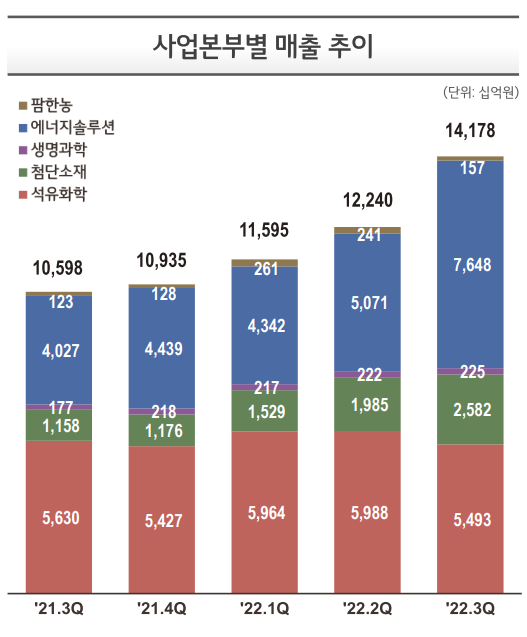 사업 부문별로는 석유화학부문에서 매출 5조 4931억원, 영업이익 926억원을 기록했다. 유가 상승 및 글로벌 인플레이션에 따른 수요 감소로 수익성은 하락했다.