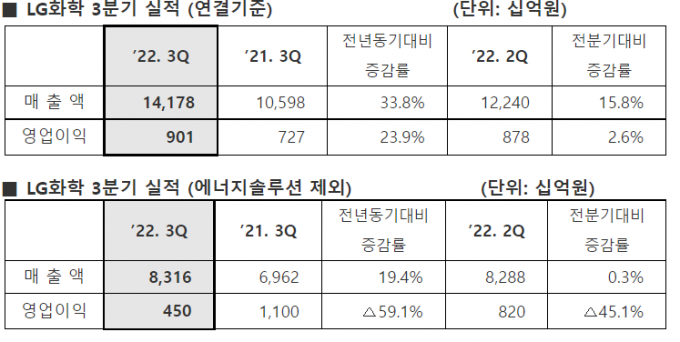 첨단소재 에너지솔루션 성장이 실적에 기여 LG화학이 올해 3분기 글로벌 경기 침체 상황에서도 실적 개선에 성공했다. 첨단소재와 에너지솔루션 등 신성장 동력으로 꼽은 사업에서 좋은 실적을 거둔 덕분이다.
