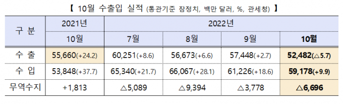 10월 수출은 524억8000만달러로 지난해 같은 기간보다 5.7% 감소했다. 수출 감소는 2020년 10월(-3.6%) 이후 2년 만에 처음이다.