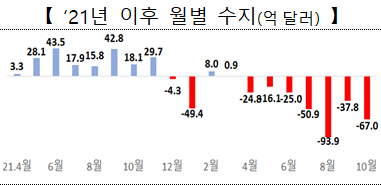산업통상자원부는 10월 무역수지 적자폭이 67억달러를 기록했다고 1일 밝혔다. 무역수지 적자가 7개월 연속 지속된 경우는 1997년 5월 이후 25년 만이다.