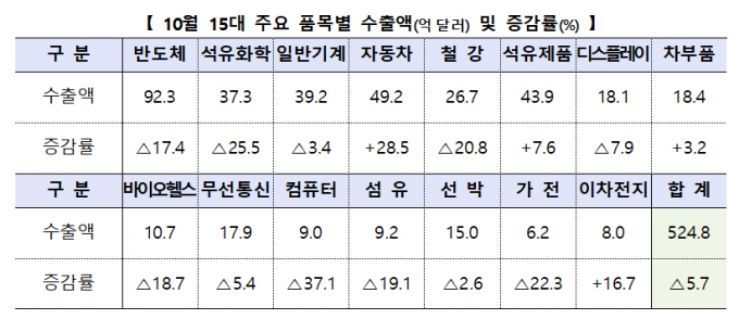 15대 주요 수출품목 중 자동차, 자동차 부품, 석유제품, 이차전지 등 4개 품목만 수출이 늘었다.