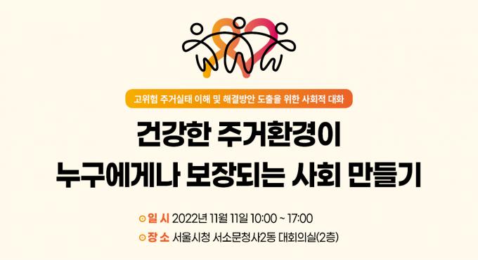이번 사회적 대화에서는 먹고 자는 것조차 어려운 환경에서 살아가는 취약계층의 현실과 상황을 알리고, 국내 최초로 정립하고자 하는 '최저 주거품질 측정 적용 프로세스 및 사례'를 공유할 예정이다. 오는 11일 오전 10시부터 오후 5시까지 진행한다. 취약계층의 주거환경 문제 및 개선에 관심있다면 누구나 참여 가능하다.