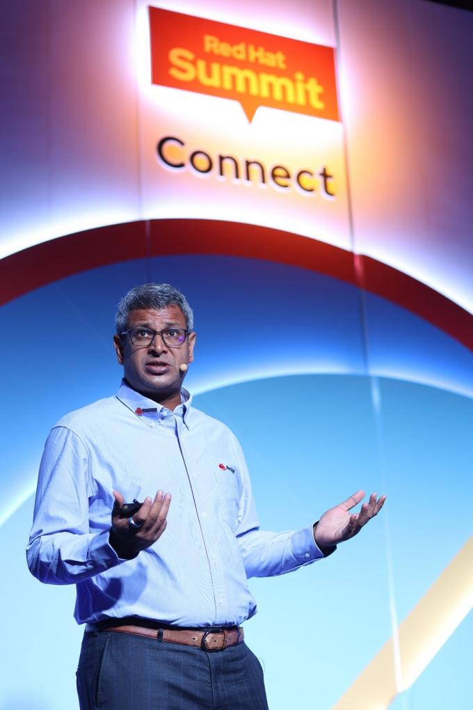 ▲ 레드햇 프렘 파반(Prem Pavan) 아시아 성장 마켓(GEMs) 총괄 부사장이 '레드햇 서밋 커넥트 서울 2022'에서 오픈소스 기술의 중요성을 설명하고 있다.[한국레드햇 제공]