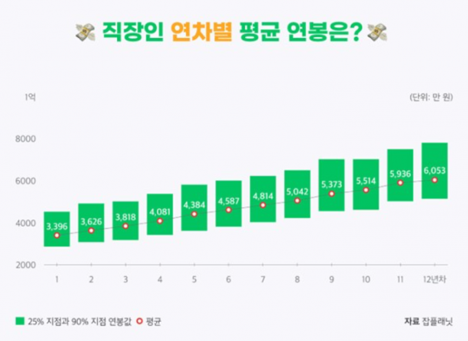 잡플래닛, 올 3분기까지 취합한 연봉데이터 분석 사회 초년생들의 평균 연봉은 3396만 원이며 8년차가 되면 5000만 원을 넘어선다는 조사 결과가 나왔다.