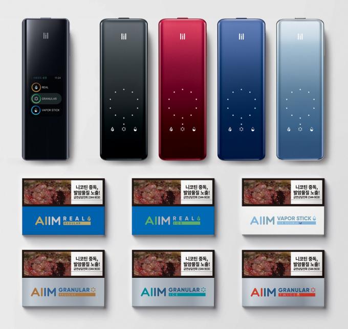 ▲ '릴 에이블 프리미엄' 1종과 '릴 에이블' 기본 모델 4종(윗줄), 전용스틱 '에임' 6종. [KT&G 제공]