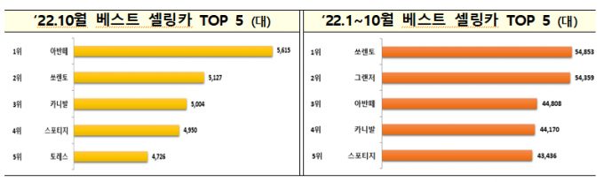 국산차들이 발군했다. 베스트셀링카 상위 5개가 모두 국산차였다. 생산량이 확대되고 출고지연에 따라 밀린 수요들이 소진되면서 완성차 대부분 판매량이 증가했다.
