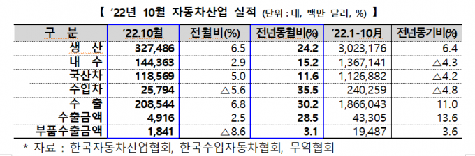 ▲ 2022년 10월 자동차 산업 실적 요약. [산업통상자원부 발표 캡처]