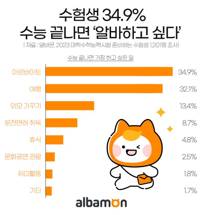 알바몬은 2023학년도 대학수학능력시험을 앞둔 수험생 1201명을 대상으로 설문조사를 실시했다. 그 결과, 아르바이트를 하고 싶다고 답한 응답자가 34.9%로 가장 많았고, '여행'을 가고 싶다는 수험생이 32.1%로 그 다음을 차지했다.