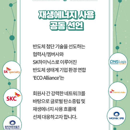 에코얼라이언스는 개별 기업이 해결하기 힘든 환경 문제를 해결하고자 2019년 출범한 협회로 SK하이닉스·SK스페셜티·SK머티리얼즈·SK실트론·SKC, 동우화인켐, 대덕전자, 미코세라믹스·코미코, 원익홀딩스·원익머트리얼즈·원익QnC·원익IPS, 하나마이크론 등이 회원이다.