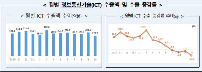 14일 산업통상자원부에 따르면 10월 ICT 수출은 9월보다는 10.3% 줄었지만 여전히 178.7억 달러를 기록하며 전체 산업의 수출을 견인했다.