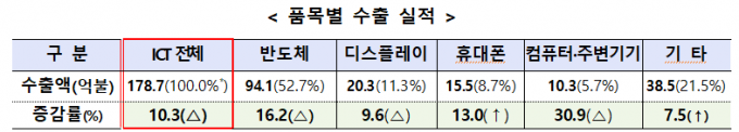 품목별로는 반도체와 디스플레이, 휴대폰, 컴퓨터와 주변기기가 전체 ICT 수출의 78.5%를 점했다.