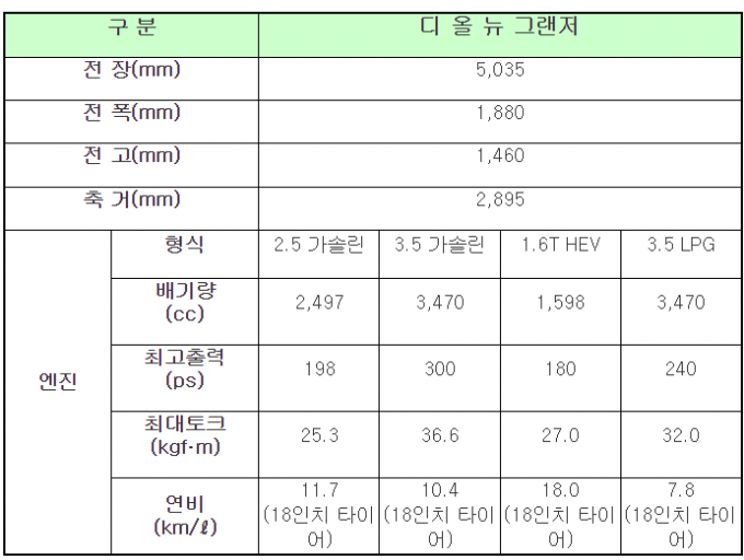 ▲'디 올 뉴 그랜저' 제원표. [현대자동차 발표 캡처]