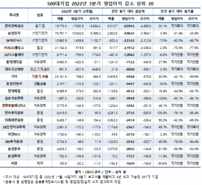 ▲ 2022년 3분기 영업익 감소 대기업 순위표. [CEO스코어 발표 캡처]