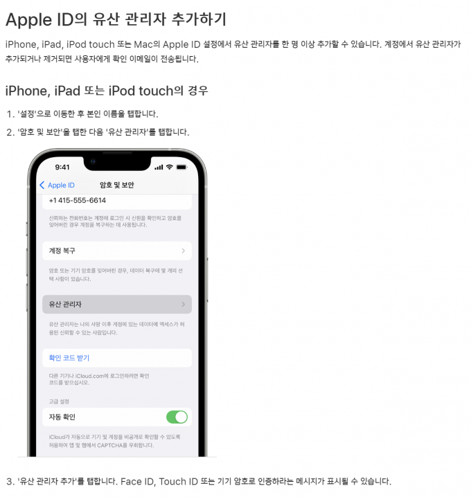 ▲ 애플 홈페이지에 나와 있는 디지털 유산관리자 설정 방법. [애플 홈페이지 캡처]