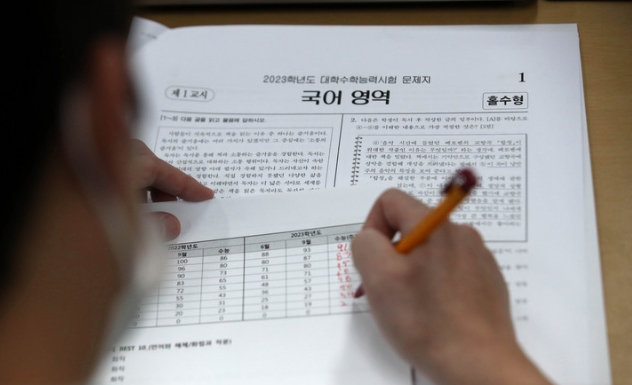 ▲ 2023학년도 대학수학능력시험일인 지난 17일 서울 마포구 노고산동 강북종로학원에 설치된 수능 문제분석 상황실에서 국어과 강사들이 수능 문제를 분석하고 있다. [뉴시스]