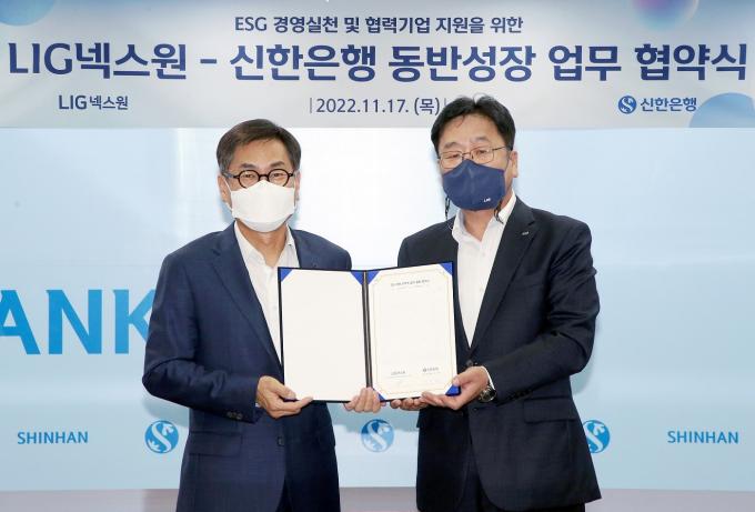 LIG넥스원은 지난 17일 서울 중구 신한은행 본점에서 홍길준 LIG넥스원 경영관리본부장, 강신태 신한은행 부행장 등이 참석한 가운데 상생펀드와 관련된 업무협약을 체결했다.