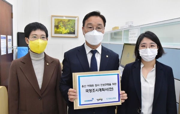 ▲ 더불어민주당 위성곤 원내정책수석부대표(가운데)와 정의당 장혜영 원내수석부대표(왼쪽), 기본소득당 용혜인 상임대표가 지난 21일 국회 의안과에 용산 이태원 참사 진상규명을 위한 국정조사계획서(안)를 제출하고 있다. [뉴시스]