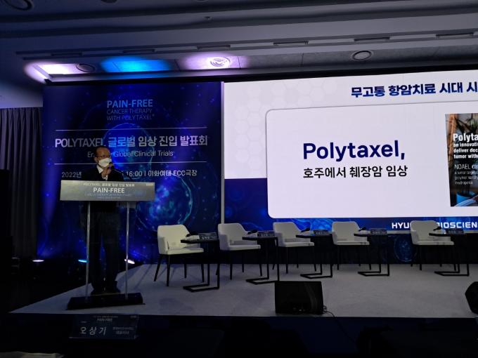 오상기 현대바이오 대표는 "췌장암은 조기진단이 어렵고 약물 전달도 어려워서 10대암 중에서 5년 생존율이 가장 낮다. 확실한 치료법이 없는 병이다. 하지만 폴리탁셀을 통해서 인류가 췌장암의 공포에서 벗어날 수 있는 날이 멀지 않았다고 믿는다"고 말했다.