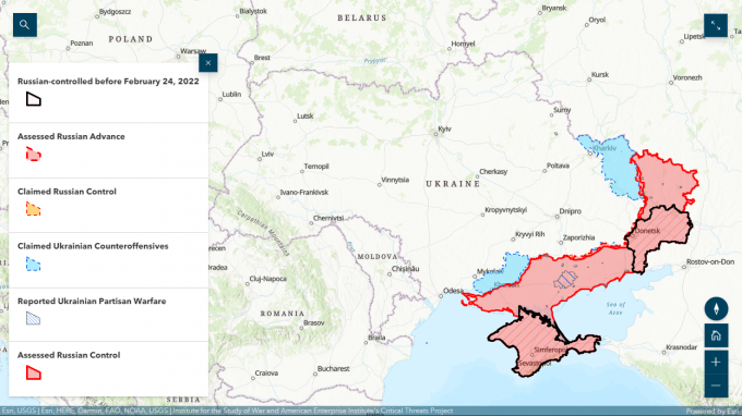 ▲ 미 전쟁연구소(ISW)의 23일(현지시간) 오후 3시 현재 우크라이나 전쟁 인터랙티브 전황지도. ISW는 러시아군이 우크라이나의 전투 의지를 떨어뜨리려는 잘못된 시도로 우크라이나의 중요 기반 시설에 대한 또 다른 대규모 조직적 미사일 공격을 실시했다고 분석했다. [ISW 누리집 캡처]