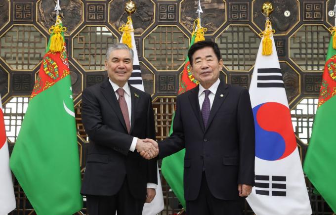 김 의장은 이날 오전 국회접견실에서 구르반굴리 베르디무하메도프 투르크메니스탄 상원의장과 회담을 열었다. 양국 의회 의장은 투자보장 협정과 에너지·인프라 협력 방안 등에 대한 의견을 나눴다.