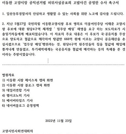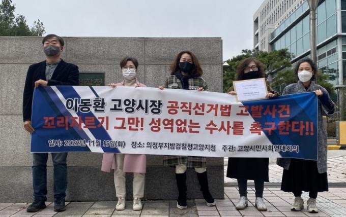 고양시민사회연대회의(시민연대)는 진작 의정부지검 고양지청과 일산동부경찰서에 '이동환 고양시장 공직선거법 허위사실공표죄 고발사건 공정한 수사 촉구서'를 와 낸 터다. "꼬리자르기 말고, 성역없이 수사하라"는 게 이들의 요구다.