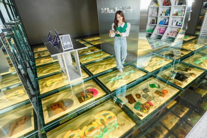 '광야@서울' 매장에는 라운지 바닥에 55인치 투명 OLED 33대가 설치돼 음반과 아이돌 굿즈(기획 상품) 상품을 진열한다. 동시에 다양한 그래픽 효과와 상품 정보를 홀로그램처럼 구현, 고객에게는 쇼핑 경험도 제공한다.