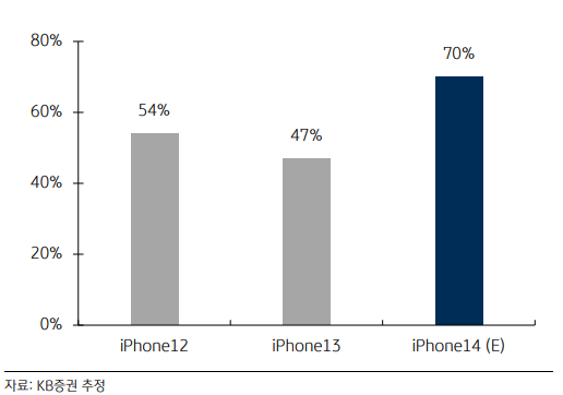 또 고급 모델인 프로 시리즈의 판매 비중이 아이폰13 47%에서 아이폰14 70%로 상승한 점도 실적 상승에 영향을 미칠 것으로 봤다.