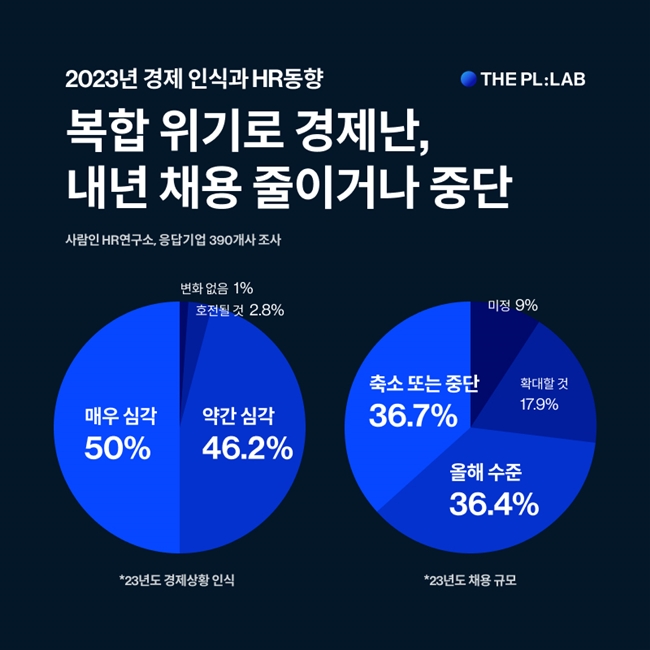 5일 사람인HR(대표 김용환) 산하 사람인 HR연구소가 기업 390개사를 대상으로 실시한 '더플랩 HR서베이: 2023 경제상황 인식과 HR 동향' 조사 결과에 따르면 기업의 36.7%가 올해보다 채용규모를 '축소하거나 중단할 것'이라고 답했다.