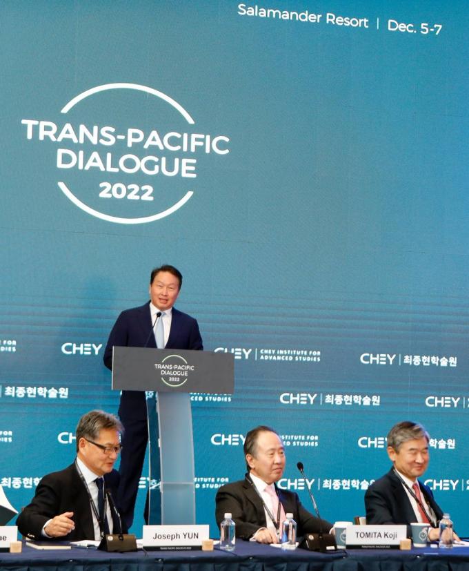 최태원 회장은 5일(현지시간) 최종현학술원이 미국 워싱턴 D.C. 인근에서 마련한 '2022 트랜스 퍼시픽 다이얼로그(Trans-Pacific Dialogue. 이하 TPD)'에 참석해 글로벌 이슈 해결을 위해 한·미·일이 함께 지혜를 모을 것을 강조했다.