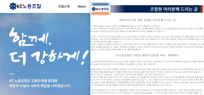 KT 노조는 지난 6일 최장복 위원장 명의로 '대표이사 연임 관련 조합원 여러분께 드리는 글'이라는 입장문을 홈페이지에 띄웠다.