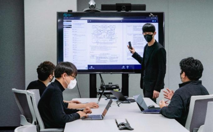 ▲ 이종민 SKT 미래 R&D 담당(우측 두번째)이 연구원들과 UAM 연동 기술 표준화를 위한 내부 회의를 하고 있다. [SK텔레콤 제공]