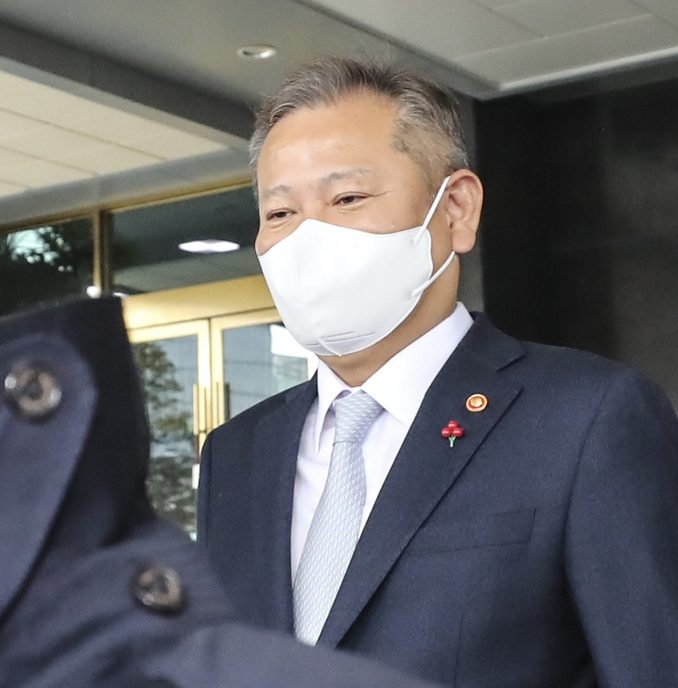 ▲이상민 행정안전부 장관이 12일 서울 종로구 세종대로 정부서울청사에서 점심식사를 하기 위해 밖으로 이동하고 있다. [뉴시스]
