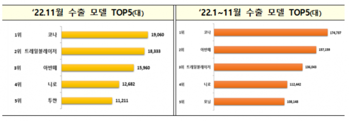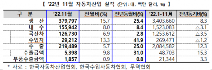 특히 11월까지 자동차 누적 수출은 물량과 금액 모두 '21년 연간 실적을 뛰어넘었다. 지난해 자동차 수출은 204만대, 465억 달러였는데 올해는 11월까지 208만대, 487억 달러다.