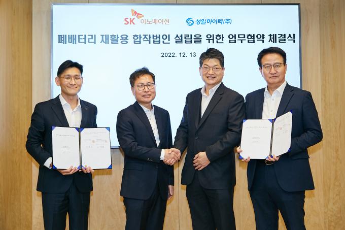 SK이노베이션과 성일하이텍은 13일 서울 종로구 SK서린사옥에서 폐배터리 금속 재활용 합작법인 설립을 위한 업무협약(MOU)을 체결했다.