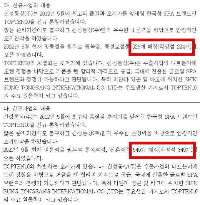 13일 금융감독원 전자공시시스템에 따르면 신성통상은 56기 1분기(2022년 7월1일~9월30일) 사업보고서에서 탑텐 매장에 대해 '2022년 9월 현재 명동점을 필두로 동성로점, 신촌점 등 540개 매장(직영점 349개)이 오픈했다'고 기재했다.
