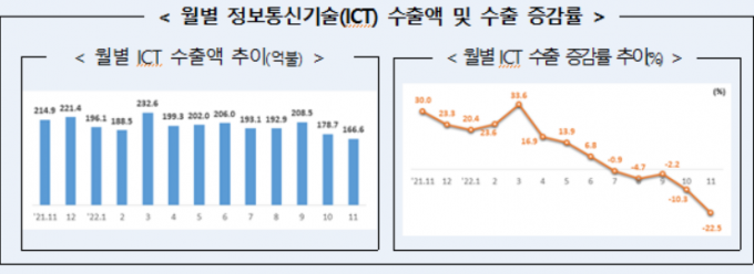 전년 대비 ICT 수출액은 무려 22.5% 급락한 것으로 나타났다. 수출 효자 품목인 반도체와 디스플레이, 휴대폰, 컴퓨터·주변기기 등 주요 품목이 모두 수출 곡선이 하락했다.