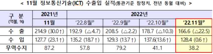 산업부는 "러·우 전쟁 장기화와 세계경기 둔화 등 전체적인 수출 적자에도 ICT는 흑자를 달성하며 적자 보전에 기여하고 있다"고 밝혔다.