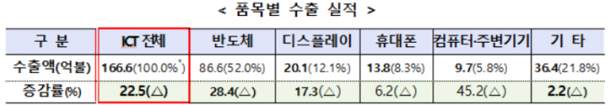 11월 ICT 수출액 166.6억 달러 중 반도체와 디스플레이, 휴대폰, 컴퓨터·주변기기 등 주요 품목이 차지하는 비중은 78.2%였다.