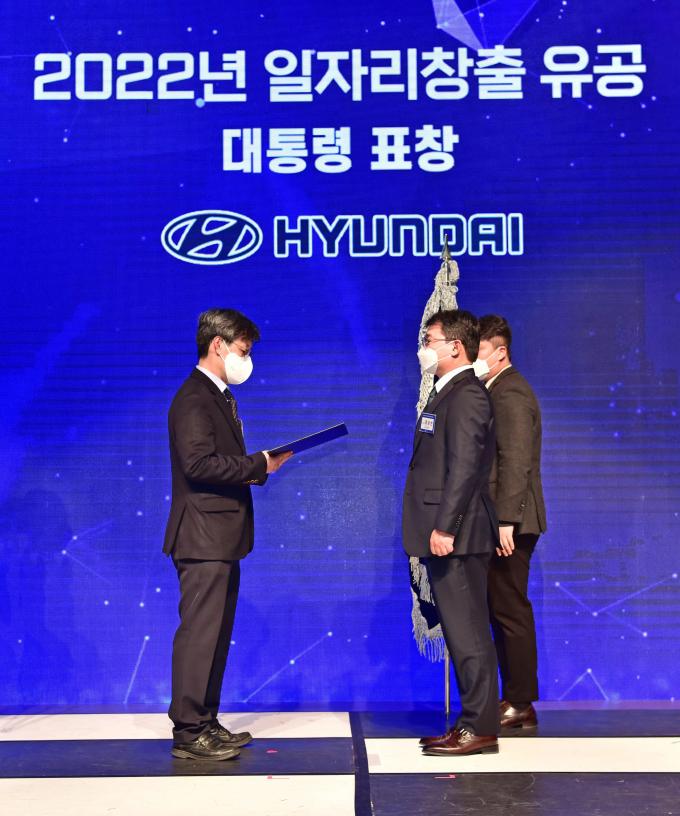인턴십 운영·스타트업 육성 공적 인정받아 현대자동차가 고용노동부 주관 '2022년 일자리 창출 유공 정부포상 수여식'에서 '청년고용촉진' 부문 대통령 표창을 수상했다고 14일 밝혔다.