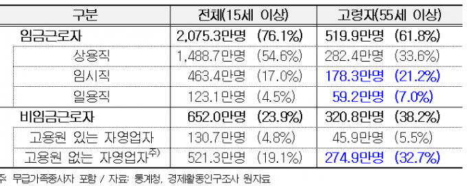 고령 취업자의 상용직 비중도 33.6%에 불과, 전체 취업자의 상용직 비중(54.6%)보다 현저히 낮았다.