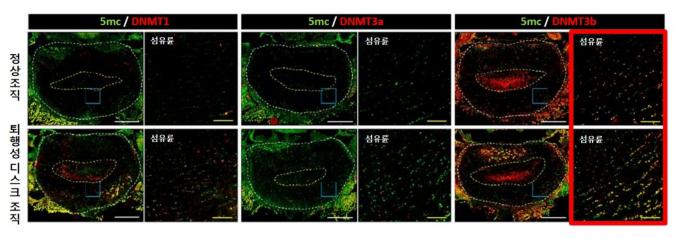 그 결과 퇴행성 허리디스크 모델의 수핵 및 섬유륜 영역에서 DNMT3b가 가장 강하게 발현됐다. 연구팀은 5mC를 발현하는 대부분의 세포가 DNMT3b를 발현한다고 볼 수 있으며, 이는 퇴행이 진행된 디스크의 DNA 메틸화에 DNMT3b 효소가 가장 크게 관여함을 의미한다고 해석했다.